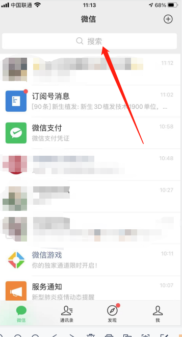 首先第一步:打开微信进入到界面之后,会看到上方有个搜索的对话框。
