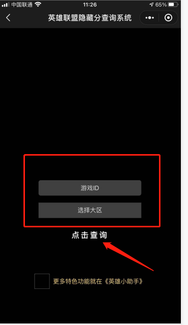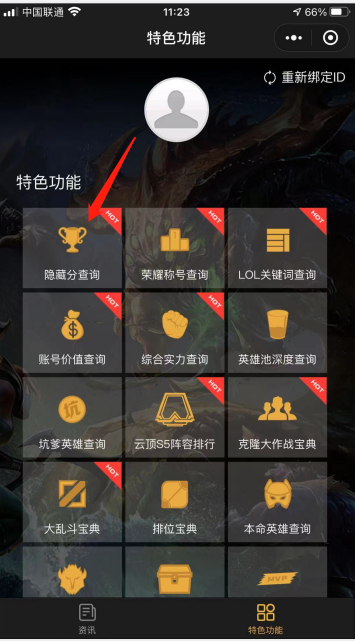 第四步:进入到英雄小助手小程序页面后,在页面中的特色功能里看到隐藏分查询。