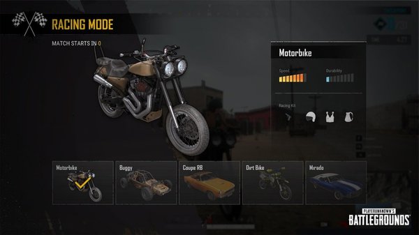 在进行竞速比赛之前,玩家可以在预备倒计时结束前挑选自己要使用的载具,包括摩托车、越野摩托车、双人越野车、酷佩RB、肌肉跑车。