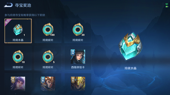 1、夺宝奖励?本次玲珑夺宝上线,召唤师通过玲珑夺宝可随机获得以下奖励之一:玲珑水晶、玲珑碎片、西施体验卡(3日)、归虚梦演体验卡(3日)、杨戬体验卡(3日)、埃及法老体验卡(3日)。