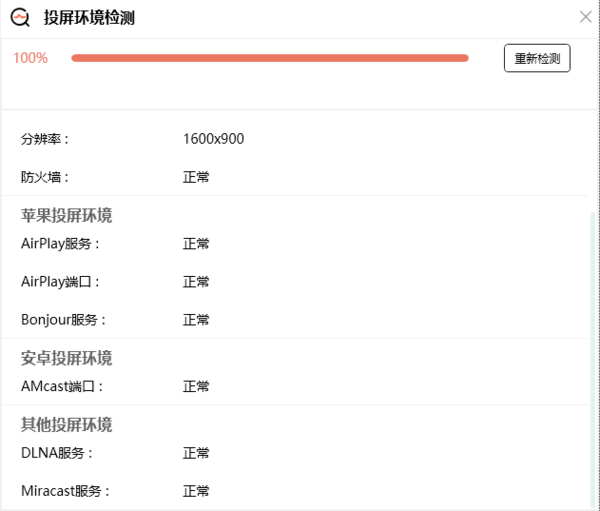 这时候会跳出一个“投屏检测”的界面,等待检测完成后,就可以看到检测结果了,如下图所示各项的结果都是正常,那么我们就可以去投屏了。