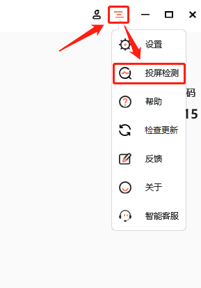 如果想看看当前的使用环境适不适合投屏,可以点击右上角的一个三条横线的按钮,然后在下面出现的菜单列表中选择“投屏检测”。