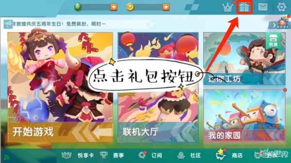 第一步,打开迷你世界游戏,进入到游戏界面后,找到界面右上角的【礼物盒】图标,并点击进入。