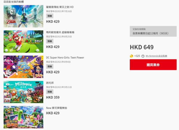 「任天堂游戏兑换券」是Nintendo?Switch?Online加入者限定商品,购买后一年内可以HKD?649的优惠价格购入2款Nintendo发行的指定下载版游戏软件。?※1※2