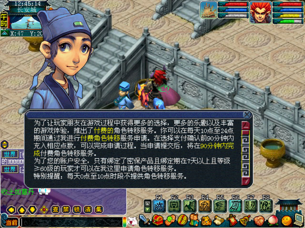 每天10点到24点期间,可以进行角色转移的申请。每天10点到24点期间,玩家进入到游戏中,在长安城(44,206)找到NPC转服使者,就可以进行转服的申请。不仅可以进行单人的转服申请,也可以进行夫妻组队的转服申请。这里有一点是需要注意的,就是可以在长安城(44,206)NPC转服使者处,直接查询转服申请的资格。符合条件的玩家,可以申请进行转服。