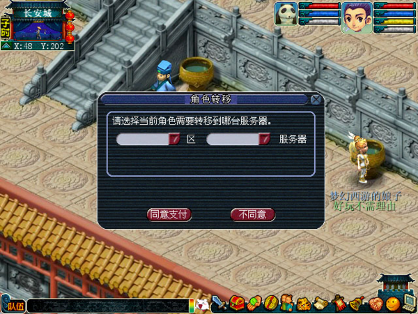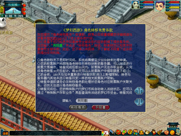 如果你符合转服的申请资格,在长安城(44,206)NPC转服使者处,选择想进要行角色转移的目标服务器。