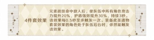 效果:元素战技命中敌人后,使队伍中所有角色攻击力提升20%,护盾强效提升30%,持续3秒。该效果每0.5秒至多触发一次。装备此圣遗物套装效果的角色处于队伍后台时,依然能触发该效果。