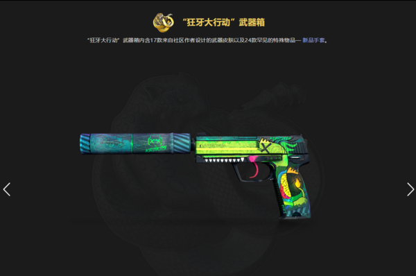 CSGO的新箱子叫SNAKEBITE?CASE,现暂译为蛇咬箱子,蛇咬箱子的金和狂牙大行动箱子的金是一样的。蛇咬武器箱中包含了17把由社区玩家设计的皮肤,以及与狂牙武器箱一样的手套皮肤作为金色稀有物品。