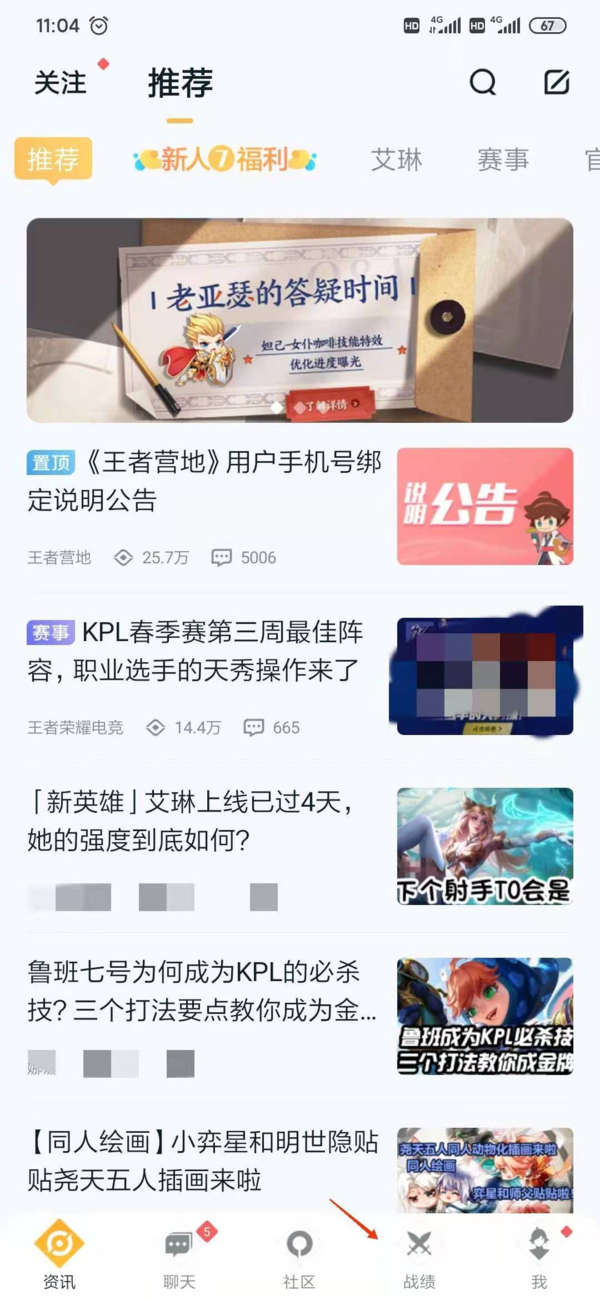 第二步,点击下方的【战绩】,界面会显示我们的账号数据和比赛信息;