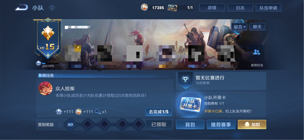 王者荣耀游戏里每名玩家都可以创建一个属于自己的小队;有了自己的小队,带上小队的成员就可以参加王者荣耀赛事了,小队最多支持7名队员。而且参加小队还有另一个好处,就是可以通过完成小队任务获得小队开黑卡,当小队成员一起参加排位赛时,对局失败优先扣除小队开黑卡,免于一次掉星。