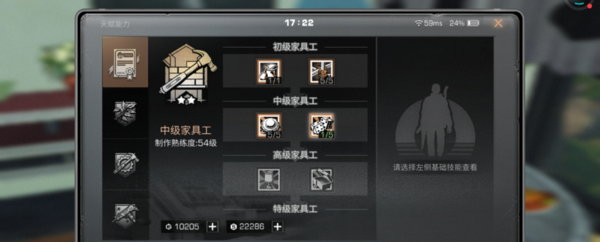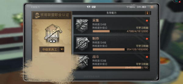 中级家具工:可以随身制作地雷,拥有陷阱大师的技能;而且还有幸运制造,在制作基础资源时有5%的几率获得一个;