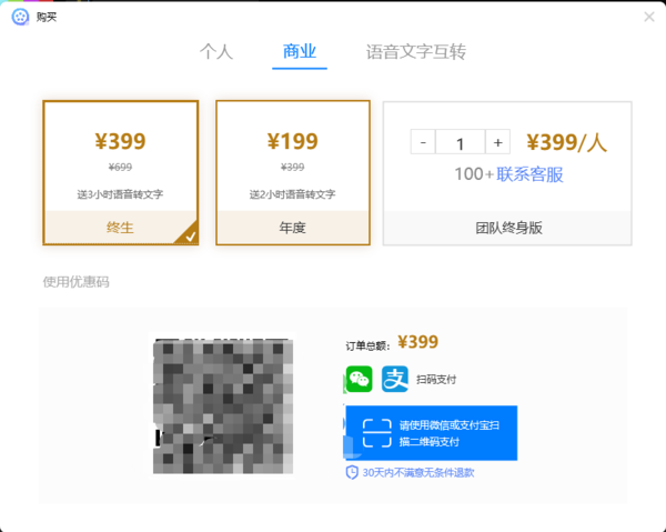 商业年度会员199元,终生会员399,也有团队终生会员399一人,如果超过100人以上需要练习客服进行手动办理会员。