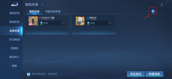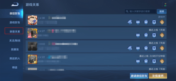 然后,点开图标后,我们就进入到游戏关系界面,在游戏关系界面中可以看到好友的亲密值,我们需要点开“亲密关系”选项;