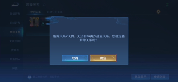 另外,删除好友也可以直接解除亲密关系,但是亲密度也会同步清空,而且是不可恢复的,所以删除好友一定要谨慎操作;解除关系后再次建立任何关系都需要七天时间,七天后才可以重新建立,当然了,解除关系是不会影响亲密度的。