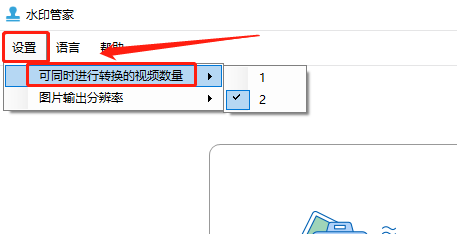 仍然是在打开水印管家后的界面上方,点击“设置”,然后在出现的选项中选择第一个“可同时进行转换的视频数量”,然后在右侧选择“2”,这时候能够同时进行转换的视频数量就增加了。