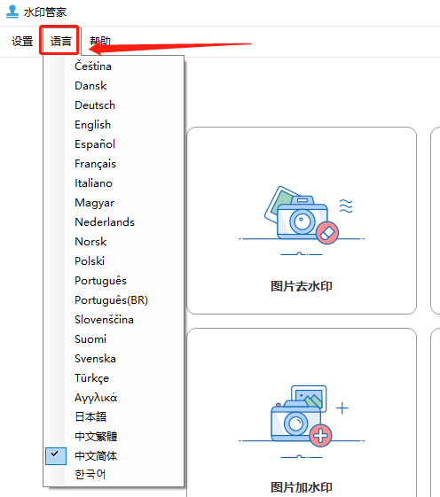 水印管家软件的默认语言是可以更改的,打开水印管家后能够看到上方有三个选项,点击“语言”,这时候会出现一个下拉菜单,里面有很多的语言选项,在这里选择需要更改的语种就可以了,不用重启就可以直接生效了。