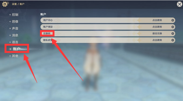 第三步,进入设置页面,在左侧菜单选择【账户】选项卡,这就出现了【兑换码】,点击即可前往兑换。