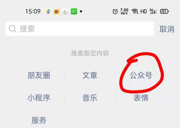 第一步,打开微信点击右上方的放大镜形状的【搜索按钮】,然后选择【公众号】。