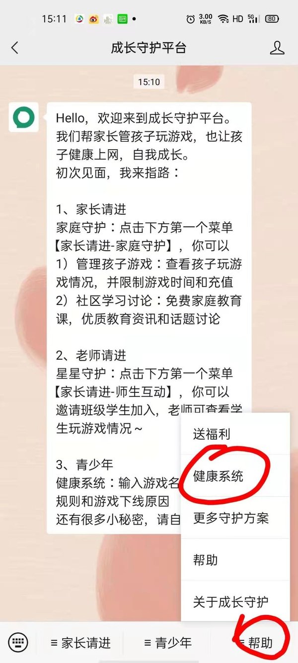 第三步,点击成长守护平台公众号页面右下角的【帮助】,并在菜单中点击【健康系统】。