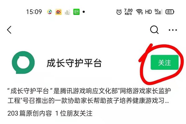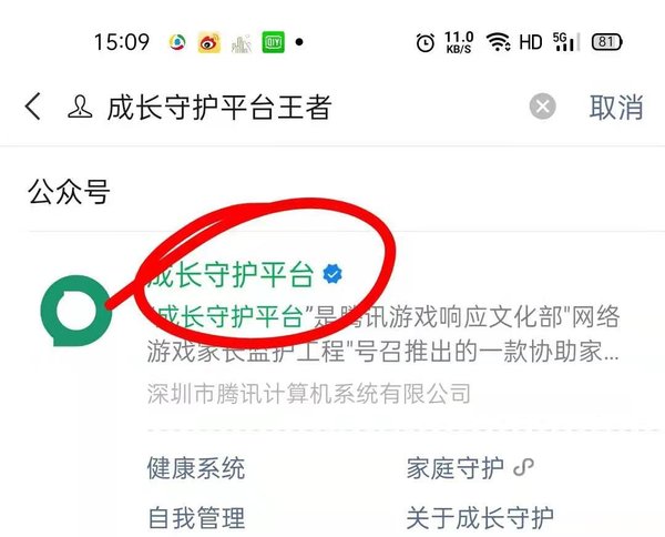 第二步,在公众号搜索界面中输入【成长守护平台】,并点击【关注】。