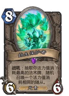 中立史诗随从,8/6/6元素,战吼:抽取你法力值消耗最高的法术牌,随机召唤一个法力值消耗相同的随从。