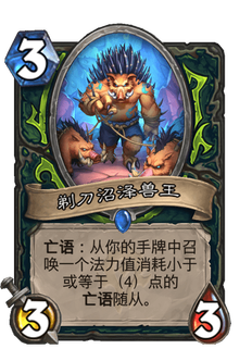 恶魔猎手稀有随从,剃刀沼泽兽王,3/3/3,亡语:从你的手牌中召唤一个法力值消耗小于或等于(4)点的亡语随从。