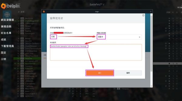 3、选择检举内容,填写意见后提交:hacker,broke?gameplay?rules,involved?in?cheating