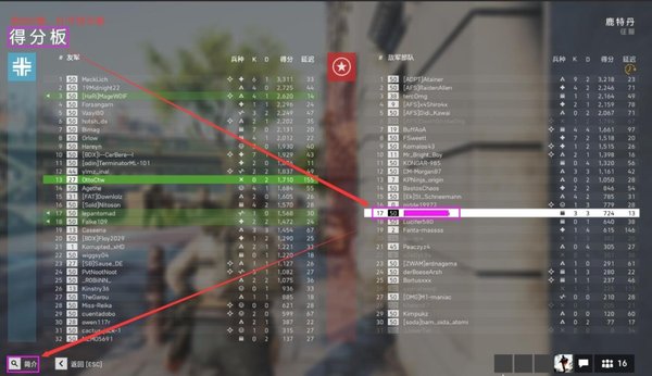 1、按esc打开得分板,找到你认为是外挂的玩家,选中后再点左下角的简介: