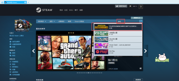 第二步,接着在网站的搜索栏中,输入【play】,而在搜索结果中的第一个,就是绝地求生游戏,点击它。