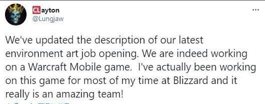 我们更新了关于最新的场景艺术设计师职位空缺的描述。我们确实在开发一款魔兽题材的手游。实际上,我在暴雪的大部分时间都是在开发这款游戏,这确实是一支了不起的团队。