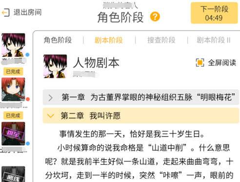 剧本选好了,接下来就是选角色了,每个人物都提供了介绍,可以根据这个人物介绍来选择所扮演的人物角色。这里要注意一下【剧本简介】要仔细阅读哟。最后点击右上角的【下一个阶段】即可。