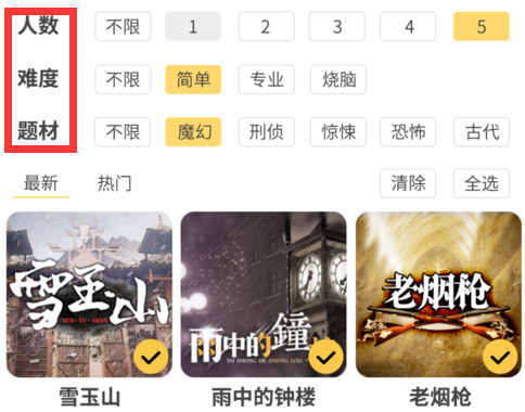 剧本杀从名字就可以看出是从剧本出发的,所以这第一步当然就是选剧本了。进入游戏之后,可以根据人数、难度和题材三个条件来判断选择进入哪个剧本。如果懒得选,或者刚开始也不知道该怎么选,有一个快速匹配的方法,也就是随机匹配,直接开始即可。