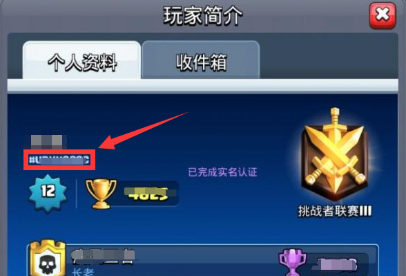 第一步,打开游戏并登录你的皇室战争游戏账号,然后点击你的头像,进入到【个人资料】页面,复制一下你的昵称下面以【#】号开头的一串字符。