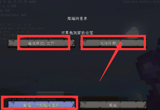 第一步,当然是打开并登录游戏账号,进入到我的世界游戏界面中,点击【设置】进入设置页面,选择游戏模式为【生存】,并【开启允许作弊】,最后点击左下方的【创建一个局域网世界】按钮。