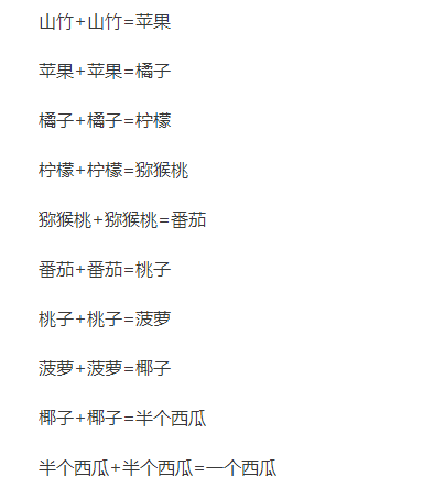 合成大西瓜的玩法其实特别的简单,就是相同的水果碰到一起就合成大个的水果,一共有10中水果,最终合成西瓜然后再合成大西瓜,玩法公式如下图所示。