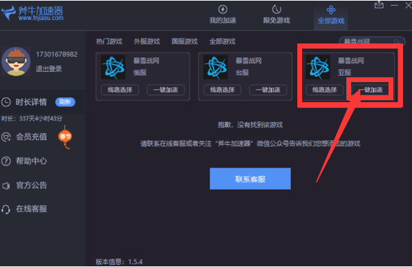第一步,需要下载安装一个网游加速器,小编这里用的是【斧牛网游加速器】,打开进入主页,搜索【暴雪战网】并点击选择【一键加速】。
