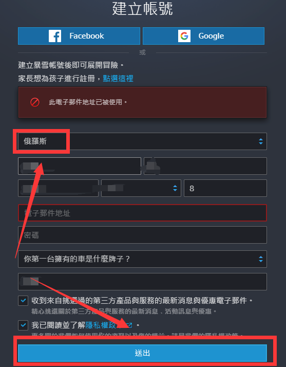 第二步,在打开的暴雪战网国际服主页进行账号注册,选择大区,然后填写注册信息点击【送出】,最后把邮箱中【验证】即可。