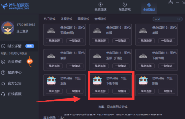 第二步,在斧牛加速器中搜索【使命召唤:战区】,然后在搜索结果中选择合适的版本下载即可。