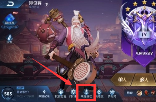 第一步,打开并进入王者荣耀,进入到排位赛界面,在页面的下方有一个【荣耀战区】选项,点击即可进入。