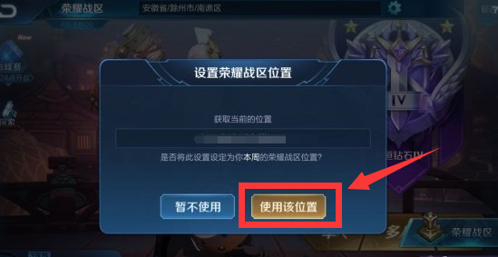 第三步,点击选择了想加入的荣耀战区标志之后,会弹出一个【设置荣耀战区位置】的提示框,我们点击【使用该位置】就好了,也可以点击【暂不使用】然后重新选择荣耀战区。
