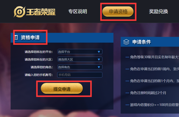 打开“王者荣耀体验服官网”之后,点击上方的【申请资格】选项,并填写【资格申请】模块的相关资料,一定要如实填写哟。最后点击【提交申请】即可。