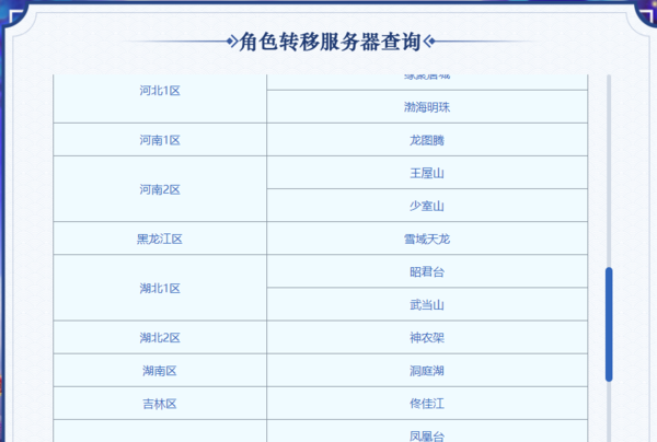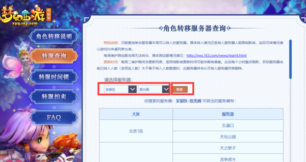 第三步,新打开的【角色转移服务器查询】页面中,选择服务器,然后点击后面的【搜索】按钮,就可以看到从该服务器中转出的服务器了。