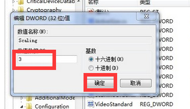第三步,鼠标右击打开【scaling】文件,并将【数值数据】参数改为【3】,点击【确定】并关闭【注册表编辑器】窗口。