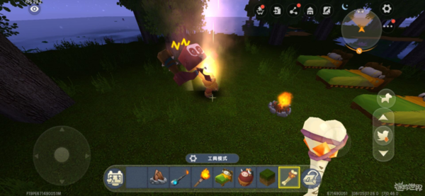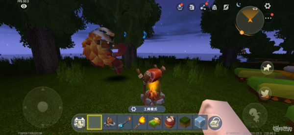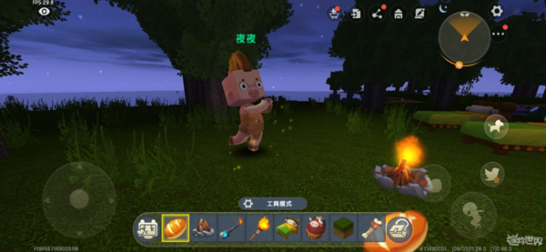 第一步,因为营业人在晚上的时候才会出现,所以我们需要先等到晚上,然后将篝火放在地方,用火炬点燃篝火,篝火点燃后在上面放上生肉进行烧烤。