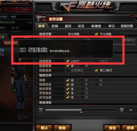 第七步,最后打开穿越火线进入到游戏页面,点击进入设置页面,设置【全屏:16bit】、【屏幕亮度:32】就可以了。