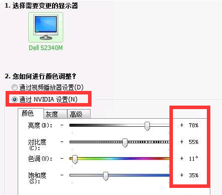 第六步,勾选【通过NVIDIA设置】,然后将【颜色】选项卡下面的参数调整为:亮度78%,对比度55%,色调11°,饱和度35%。