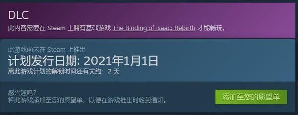 根据《以撒的结合:忏悔》Steam商店页面价格位置的显示,游戏的计划发行日期为2021年1月1日。不过最近有玩家发现在这个发售日期可能已经作废。