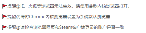 第一步,使用Chrome内核浏览器打开并登陆Steam账号,此处需要注意事项如下图所示。