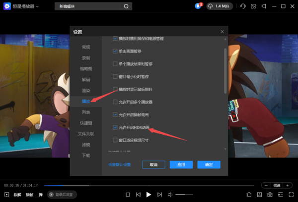 PC版恒星播放器拥有的第三个隐藏功能就是支持HDR动画功能,而此功能的主要作用就是尽量更大程度地去还原,打开插帧功能和HDR动画功能,视频画质会有质的飞跃。HDR动画功能,在PC版恒星播放器设置的播放设置界面当中就可以找到。