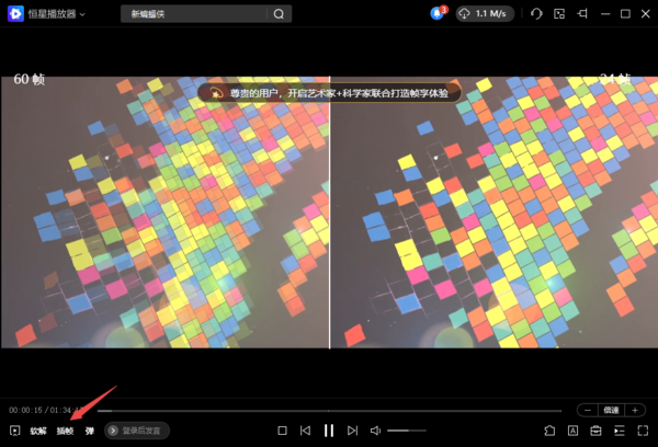 PC版恒星播放器拥有的第二个隐藏的功能是独家插帧功能,在开启这个功能后,软件就会自动进行智能处理,以此来提高视频播放的流畅度与画质,同时也支持自动调节插帧率。插帧功能在PC版恒星播放器播放视频时,界面底部的左下角位置,就可以找到。